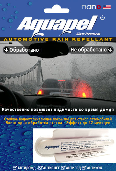 Aquapel Glass Treatment Ваш шанс прекрасно видеть дорогу во время дождя. Аквапель может быть использован на любом стекле где необходим обзор. Aquapel с успехом применим как для авто, катеров, яхт так и для и дома. Аквапель разработан и запатентован PPG Industries, лидером производства стекол различного назначения, Aquapel Glass Treatment представлен как продукт призванный улучшить безопасность вождения. Аквапель разработан для профессионального применения для обработки лобового стекла, боковых и задних стекол а также для любой стеклянной поверхности, Aquapel образует долгую защиту, и обладает свойствами: