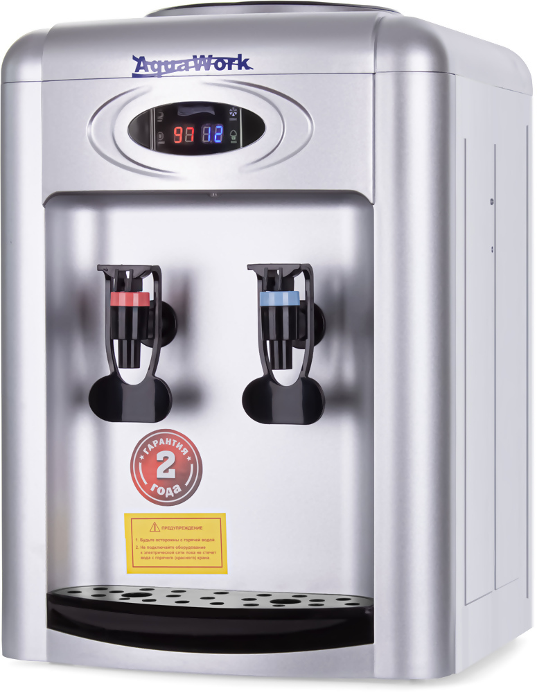Настольный кулер Aqua Work 0.7-TDR-ST это практичное решение для тех, кто ценит функциональность, экономичность и стильный дизайн.Компактный размер, продвинутые технологии и режим энергосбережения делают этот аппарат прекрасным выбором для дома или офиса.Особенности Aqua Work 0.7-TDR-ST🔥 Мощный нагрев:Бак объемом 1 литр с нагревательным элементом мощностью 700 Вт.Способен выдать до 7 литров горячей воды в час с температурой 9798C.❄️ Электронное охлаждение:Обеспечивает до 1 литра прохладной воды в час с температурой на 1214C ниже комнатной.💡 Индикация температуры:Встроенные датчики показывают текущую температуру в горячем и холодном бачках, что делает контроль состояния максимально удобным.⚡ Энергоэффективность:Кнопка Эко позволяет переключить аппарат в режим энергосбережения: автонагрев отключается, а вода подогревается только при нажатии кнопки нагрева до температуры 9798C.🔧 Простое управление:Два удобных крана типа нажим кружкой обеспечивают легкий доступ к воде любой температуры. Кнопка принудительного включения нагрева гарантирует максимальную температуру получаемой воды.✨ Держатели стаканчиков:На корпусе из пластика можно закрепить стаканодержатели с помощью шурупов или двустороннего скотча!🌙 Ночная подсветка:Подсветка краников и зоны розлива делает использование аппарата комфортным даже в условиях недостаточной освещенности.Где будет уместен энергосберегающий кулер?🎯 Для домашних пользователей, которым нужен компактный и функциональный кулер без лишних затрат на электроэнергию.🎯 Для офисов, где важна экономия места и доступ к горячей и прохладной воде.🎯 Для мест с ограниченным пространством, где требуется надежное устройство для розлива воды.Почему стоит выбрать эту модель?✅ Быстрый нагрев:Мощность 700 Вт гарантирует получение достаточного количества горячей воды для приготовления любимых напитков.✅ Эффективное охлаждение:Электронная система охлаждения обеспечивает прохладную воду даже в жаркую погоду.✅ Экономичность:Режим Эко минимизирует потребление электроэнергии, делая использование более выгодным.✅ Контроль температуры:Индикация температуры воды в бачках помогает всегда быть в курсе её готовности.✅ Стильный дизайн:Компактные размеры и современный внешний вид делают аппарат прекрасным дополнением любого интерьера.Как работает устройство?1️⃣ Установите бутыль с водой сверху.2️⃣ Используйте соответствующие краны для набора горячей или прохладной воды.3️⃣ При необходимости активируйте режим Эко, чтобы снизить потребление электроэнергии.4️⃣ Для получения максимально горячей воды воспользуйтесь кнопкой принудительного включения нагрева.5️⃣ Наслаждайтесь подсветкой зоны розлива в вечернее время.Гарантия качества!Производится в России компанией Аква Маркет, которая контролирует каждый этап изготовления.Мы предоставляем 24-месячную гарантию при покупке на нашем сайте или в фирменных магазинах Аква Маркет.Ваше спокойствие и удовлетворение для нас важнее всего!⚠️ Важно: Перед первым использованием проверьте правильность установки бутыли и ознакомьтесь с инструкцией.Почему именно Aqua Work 0.7-TDR-ST?✅ Быстрый нагрев до температуры 9798C.✅ Электронное охлаждение с температурой 1214C ниже комнатной.✅ Индикация температуры.✅ Экономия электроэнергии.