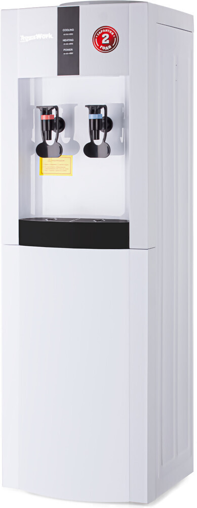 Классический напольный кулер для воды Aqua Work 16-LR с нагревом и компрессорной системой охлаждения, простой аппарат без наворотов.Нагрев - не менее 7 литров в час до температуры 90-96 С (мощность 700 Вт, бак объемом 1 литр);Охлаждение - не менее 2 литров за час до температуры 7-10 градусов;Два краника типа нажим кружкой;Высота аппарата - 960 мм, такой рост удобен для большинства пользователей кулера;Строгий минималистический дизайн;Индикаторы режимов работы (подключение к сети, нагрев и охлаждение) в черном прямоугольном блоке вверху аппарата;Стальной корпус позволяет закреплять стаканодержатели на магните или на двойном скотче;Диспенсер Aqua Work 16-LR производится и собирается в России. Мы предоставляем 2 года гарантии про покупке этого аппарата на нашем сайте или в магазинах Аква Маркет.
