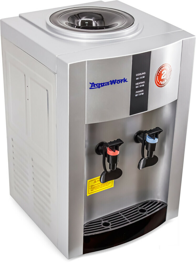 Практичный и функциональный настольный кулер Aqua Work 16-TR для тех, кто ценит простоту и эффективность без лишних изысков.Компактные размеры и продуманные технические решения делают его отличным выбором для дома или офиса.Особенности модели🔥 Мощный нагрев:Нагревательный элемент мощностью 700 Вт.Способен выдать не менее 7 литров горячей воды в час с температурой 9096C.❄️ Эффективное охлаждение:Компрессорная система охлаждения обеспечивает до 2 литров холодной воды в час с температурой 710C.🔧 Простое управление:Два удобных крана типа нажим кружкой позволяют легко набирать воду любой температуры. Индикаторы режимов работы (подключение к сети, нагрев и охлаждение) расположены в черном прямоугольном блоке сверху аппарата, что делает управление интуитивно понятным.✨ Универсальные аксессуары:Корпус из стали позволяет закреплять стаканодержатели любого типа как на магнитах, так и на двустороннем скотче. Выбирайте наиболее удобный вариант для себя!📦 Компактный дизайн:Простой и понятный внешний вид делает этот аппарат прекрасным решением для любого интерьера. Без лишних декоративных элементов, но с необходимым функционалом.Где лучше устанавливать Aqua Work 16-TR?🎯 Для семей, которым нужен надежный кулер без лишних наворотов.🎯 Для офисов, где важна доступность горячей и холодной воды при минимальных затратах на обслуживание.🎯 Для мест с ограниченным пространством, где требуется компактное решение для розлива воды.Почему стоит выбрать именно это устройство?✅ Быстрый нагрев:Мощность 700 Вт гарантирует получение достаточного количества горячей воды для приготовления любимых напитков.✅ Эффективное охлаждение:Компрессорная система охлаждения обеспечивает холодную воду даже в самые жаркие дни.✅ Надежность:Продуманная конструкция и качественные материалы гарантируют долгий срок службы.✅ Стильный дизайн:Компактные размеры и строгий внешний вид делают аппарат идеальным дополнением любого интерьера.Как работает аппарат?1️⃣ Установите бутыль с водой сверху.2️⃣ Используйте соответствующие краны для набора горячей или холодной воды.3️⃣ Контролируйте работу системы по индикаторам в верхней части аппарата.4️⃣ При необходимости установите стаканодержатель на удобную вам сторону.Гарантия качества!Производится в России компанией Аква Маркет, которая гарантирует высокое качество каждого изделия.Мы предоставляем 24-месячную гарантию при покупке на нашем сайте или в фирменных магазинах Аква Маркет.Ваше спокойствие и удовлетворение для нас важнее всего!⚠️ Важно: Перед первым использованием проверьте правильность установки бутыли и ознакомьтесь с инструкцией.Почему Aqua Work 16-TR?✅ Простота и надежность конструкции.✅ Быстрый нагрев до температуры 9096C.✅ Эффективное компрессорное охлаждение с температурой 710C.✅ Компактный дизайн с оптимальными размерами для настольного размещения.✅ Возможность использования любых типов стаканодержателей.