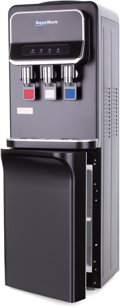 Напольный кулер для воды Aqua Work V93-W с нагревом, охлаждением электронного типа и небольшим шкафчиком в черном матовом корпусе из стали.Оснащен литровым бачком с мощностью 550 Вт, достаточным для нагрева в течение часа не менее 5 литров воды до температуры 90 и более градусов.Обычное, электронное охлаждение, мощность 75 Вт, позволяет в течение часа получить не менее 0.7 литров (т.е. 3-4 стакана) с температурой на 12-14 градусов ниже температуры в помещении.3 краника типа нажим кружкой для набора горячей, охлажденной и воды комнатной температуры.Привлекательный черный корпус с великолепным матовым покрытием.Поблескивающие краники и дополнительные детали оформления подчеркивают эффектный внешний вид.Можно использовать любые стаканодержатели - на шурупах и на магнитах.Шкафчик с габаритами 23.5 х 33.5 х 15.5 см для различных продуктов и припасов к чаю/кофе, не нуждающихся в охлаждении.Элегантный напольный диспенсер Aqua Work V93-W со всем необходимым на своем борту - для Вашего офиса и дома.