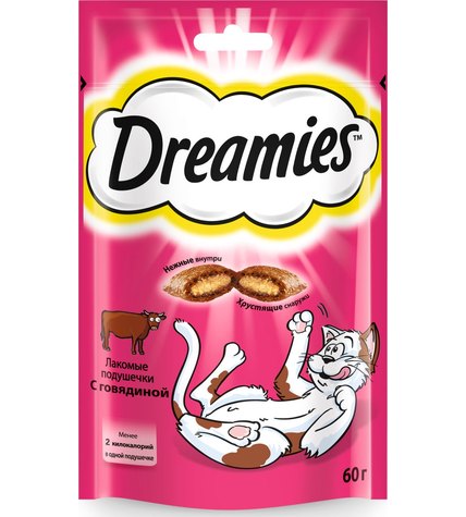 Dreamies с говядиной – настоящее мясное лакомство для вашего питомца! Покажите вашему коту эту упаковку нежных внутри и хрустящих снаружи подушечек, и он будет в восторге. Устройте ему настоящий праздник мяса!