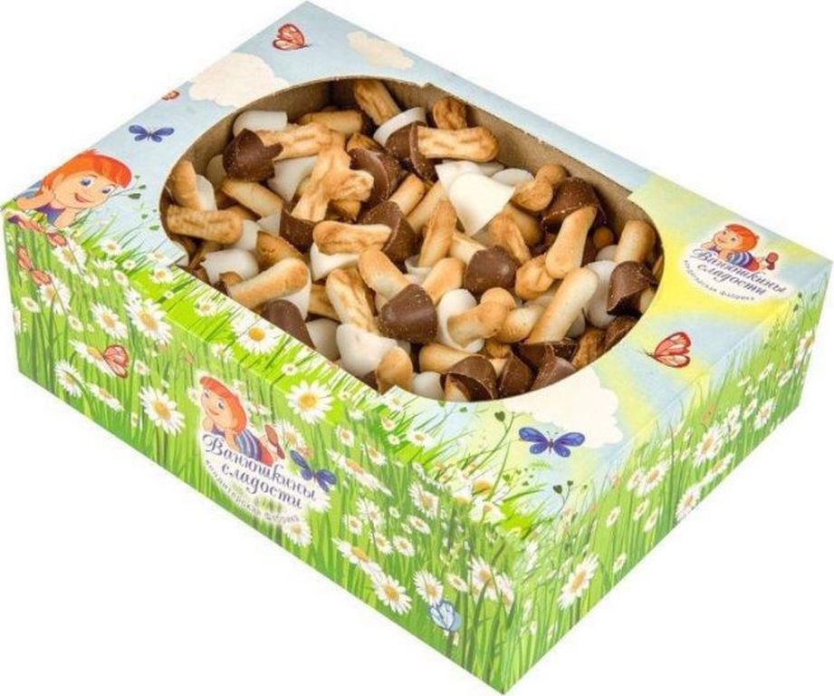 Мука пшеничная хлебопекарная в.с, сахарная пудра, маргарин (рафинированные дезодорированные растительные масла, вода, соль поваренная пищевая, эмульгаторы: Е471,Е475, ароматизатор “Сливки”, регулятор кислотности лимонная кислота, красители: “Аннато”, “Куркумин”), глазурь кондитерская (сахар, заменитель какао-масла лауринового типа, какао-порошок, эмульгаторы: Е322, Е476, ароматизаторы: “Ванилин”, “Шоколад”), глазурь кондитерская белая (сахар, заменитель какао-масла лауринового типа, сухие молочные продукты, эмульгаторы: Е322, Е476, ароматизатор “Ванилин”), мука кукурузная, инвертный сироп (сахар, вода питьевая, регулятор кислотности-кислота лимонная, бикарбонат натрия), молоко сгущенное с сахаром (молоко цельное, молоко обезжиренное, сахар, молочный сахар (лактоза)), яичный порошок, разрыхлители (бикарбонат аммония, бикарбонат натрия), соль, эмульгатор “лецитин соевый”, ароматизатор “Ванильно-сливочный”, консервант - сорбат калия.