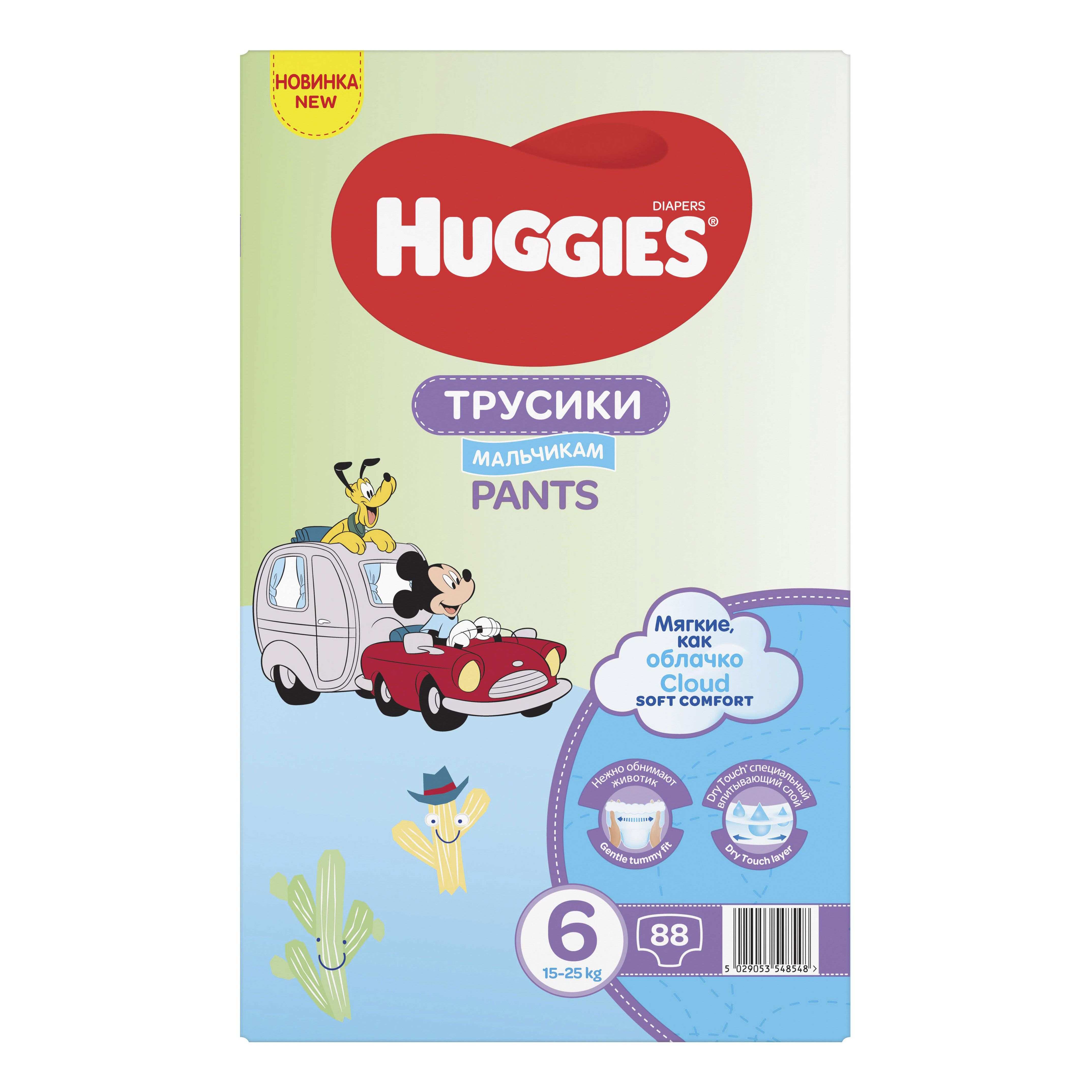 Новинка! Huggies Трусики для мальчиков Трусики-подгузники Huggies для мальчиков стали еще лучше благодаря новому пояску — мягкому, как облачко. Дополнительный сверхмягкий слой обеспечивает комфортную и эластичную посадку с меньшим давлением, снижая риск появления красных следов на коже ребенка. В течение дня поясок подгузников адаптируется к меняющимся размерам животика, нежно обнимая его. Трусики Huggies® созданы для малышей, которые активно двигаются — много ползают, делают свои первые шаги или уже уверенно топают по дому маленькими ножками. Специальный впитывающий слой DryTouch расположен с учетом анатомических особенностей мальчиков, впитывая влагу за секунды и сохраняя кожу сухой днем и ночью. Обновленные трусики Huggies с мягким, как облачко, пояском — нежная забота и надежная защита для максимального комфорта активных мальчиков. Окутайте малыша мягкостью облака! Преимущества: поясок-облачко — дополнительный сверхмягкий слой еще нежнее обнимает животик малыша; идеальная посадка и комфорт для активных детей благодаря эластичному 2-зонному цельному пояску; слой DryTouch, расположенный с учетом анатомических особенностей мальчиков, сохраняет кожу сухой днем и ночью; мягкие эластичные резиночки вокруг ножек обеспечивают дополнительную защиту от протекания; легко надеть — просто натяните трусики, легко снять — разорвите боковой шов; индикатор влаги подскажет, когда придет время сменить трусики; липучка-утилизатор закрывает запахи на замок — просто сверните использованный подгузник и закрепите липучкой; новый дизайн с любимыми героями Disney.