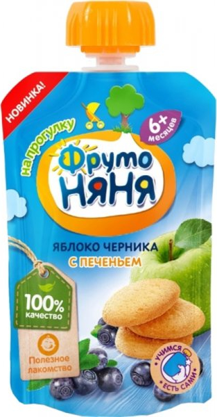 Пюре из яблок, пюре из черники, вода питьевая, печенье (мука пшеничная, сахар, масло сливочное , яйцо куриное, экстракт солодовый, молоко сухое цельное, крахмал кукурузный, разрыхлители (карбонаты аммония, карбонаты натрия), натуральный ароматизатор «Печенье».