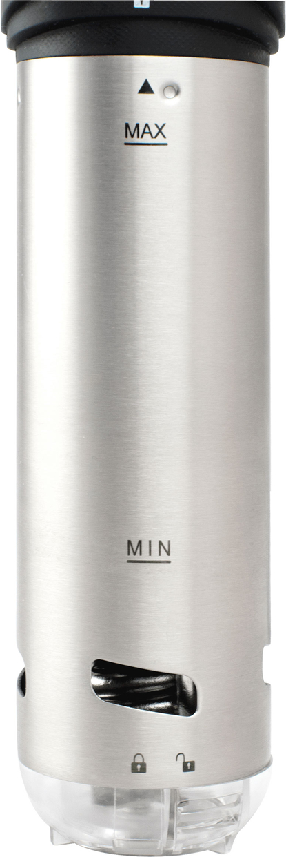 Рециркуляционный насос производительностью до 8 л/мин обеспечивает равномерный нагрев воды. Погружной термостат может быть использован с любыми емкостями, объем которых составляет 6-15 л, в том числе с гастроемкостями из поликарбоната, поскольку температура приготовления не превышает 90°С. Устройство закрепляется на стенке емкости при помощи фиксатора.