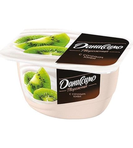 Творог обезжиренный, сливки, обезжиренное молоко, сахар, фруктовая добавка (киви, косточки киви, сахарный сироп, загустители: Е1422, камедь рожкового дерева, гуаровая камедь, пектин, ароматизатор идентичный натуральному - киви, краситель: Е141, регуляторы кислотности: цитрат натрия, цитрат кальция, лимонная кислота)