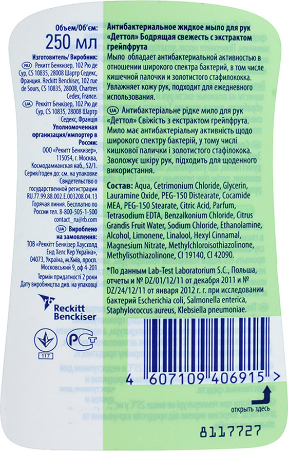 Вода, глицерин, ПЭГ - 175, дистеарат, цетримониум хлорид, лаурамин оксид, лорамид Дей, акрилаты.ПЭГ-10 малеат.стирен сополимер, ЭДТА, ароматизатор, бензофенон-4, лимонной кислоты моногидрат, бензалкония хлорид, алкоксилированный диэфир миристинового спирта и адипиновой кислоты, пропиленгликоль, лактоза, экстракт грейпфрута, метилхлороизотиазолинон.метилизотиазолинон.